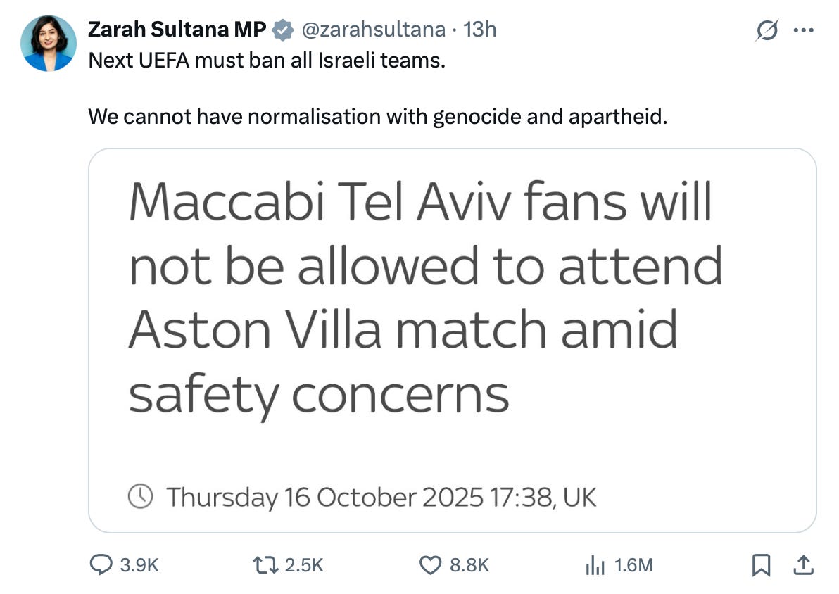 And now there’s the ban on Maccabi Tel Aviv fans from attending their team’s Europa League match against Aston Villa. The Safety Advisory Group deemed it too risky to allow Israeli fans to travel to this match in Birmingham, citing potential protests and violence. The police accepted this decision.