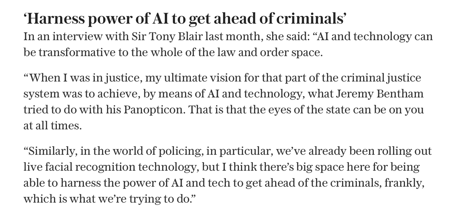 In one of the most shocking the-quiet-bit-was-said-out-loud moments, the UK Home Secretary has said her ‘ultimate vision’ for criminal justice is the Panopticon using AI and surveillance technology.