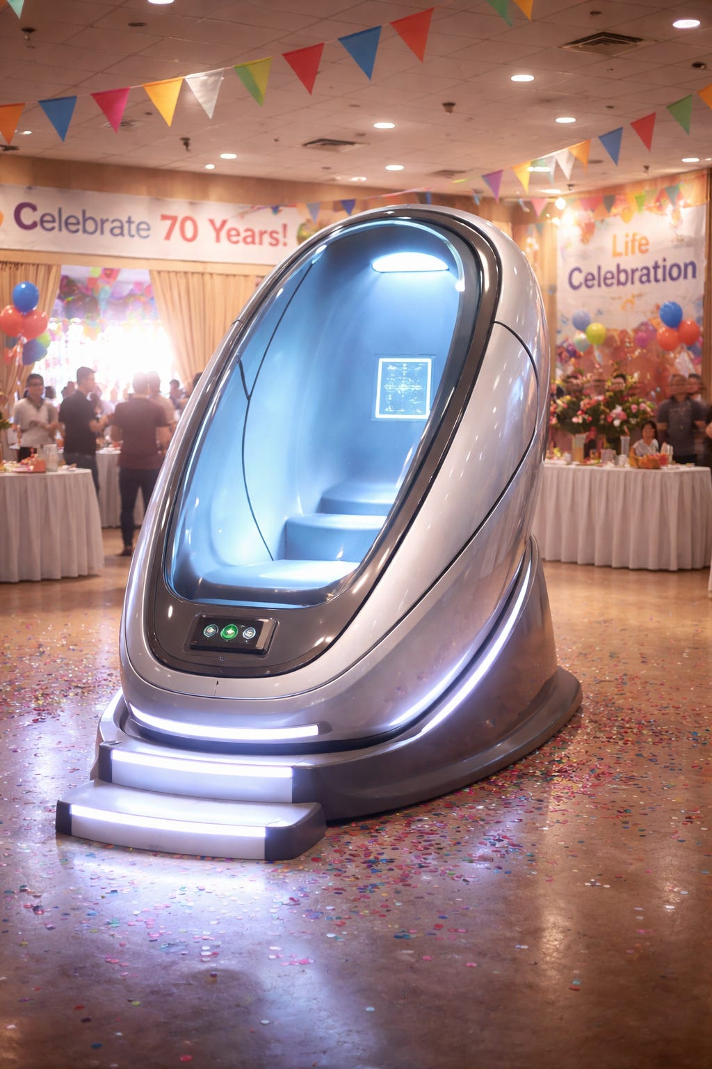 The self-operant ascends the short flight of steps to sustained clapping, pausing at the top to wave. The Pod’s wide window ensures they can see the celebration continue uninterrupted through their final moments. The button pressed, nitrogen is released and retirement is achieved.